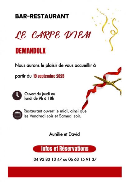 À partir du vendredi 19 septembre 2025, Aurélie et David vous ouvrent les portes du Bar-Restaurant Le Carpe Diem. Ils auront à cœur de vous accueillir dans une ambiance conviviale et chaleureuse.